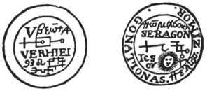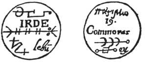 Теперь мы будем трактовать о Сатурне и его действии. Эта печать делается из золота. Свинец не придает никакой силы другим металлам. Кольцо надо сделать медным. Изготовь печать и кольцо в час вхождения Солнца в Козерога, когда оно от нас на максимальном удалении. Гравируй в день и час Сатурна, когда он в хорошем аспекте с какой-либо другой планетой. Повесь печать на убывающей Луне. Что касается часа аспекта, то не важно, будет ли то Луна или какая-то иная планета. Эту монету в народе можно назвать печатью благосклонности.