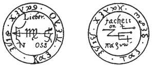 Вот формула Весов, ее знаки и печать. Расплавляют чистую отборную медь в час, когда Солнце входит в Весы. Солнце входит в знак Весов в сентябре, тринадцатого или четырнадцатого числа, в соответствием с движением года. Отметь для себя: если Венера – хозяин или охранитель этого года, печать будет обладать гораздо большей силой (особенно если ее носят люди, родившиеся под знаком Венеры). Когда Венера войдет в Весы, надо выбить следующие буквы, слова и знаки и повесить печать в день и час Венеры, то есть в первый или восьмой час того же дня: