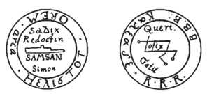 Печать эта чрезвычайно эффективна против любых женских наговоров, лишающих мужчин их мужской силы. Помогает она также при всех болезнях половых органов.