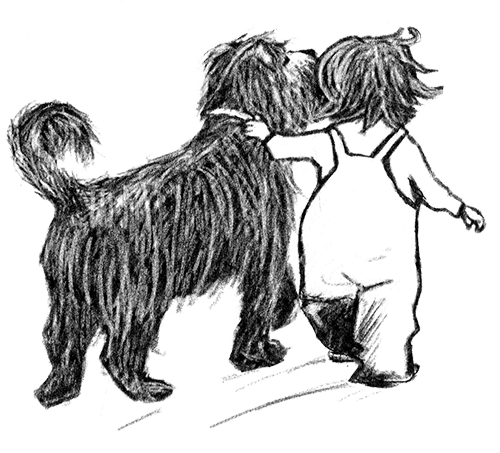 Когда мы идём на прогулку, Малышка крепко держится за мой ошейник. Это немножко неудобно, потому что я не могу гоняться за зайцами.