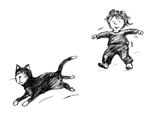 Мицци боится её как огня: стоит Малышке войти в комнату, кошка пулей слетает с лучшего местечка, юркает под диван или под буфет и так там и сидит.