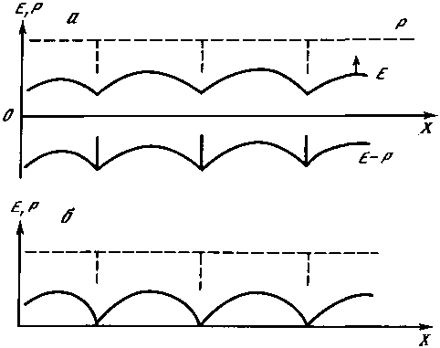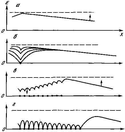 Пусть на некотором отрезке значения потенциала вдоль оси x неизменны и равномерно нарастают во времени. Кривая значений пороговой функции имеет микрошероховатость, но также в целом прямолинейна и не имеет наклона (рис. 29, а). Эффект смещающейся границы в этой ситуации отсутствует.
