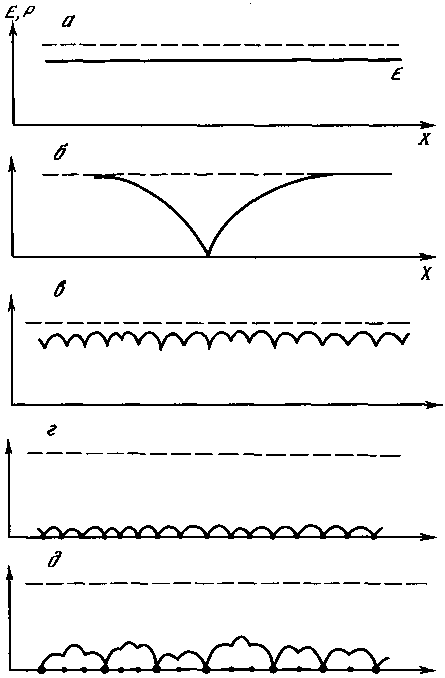 При нарастании значений потенциальной функции в какой-то точке микроминимума пороговой функции возникнет первый элемент. Если в этот момент нарастание потенциала прекратится, то этот элемент будет единственным на рассматриваемом отрезке. Примем, что его «углубление» происходит относительно медленно, зона разгрузки медленно расширяется и лишь через какое-то время она достигает своих конечных размеров (см. рис. 29, б). А теперь предположим, что потенциальная функция продолжает нарастать, «не дожидаясь», когда полностью сформируется первый элемент. При этом произойдет зарождение множества других элементов, причем появятся они и вблизи первого, так как он еще «не углубился» и его окружает узкая зона разгрузки. Все новые элементы будут появляться, «не дожидаясь» расширения зон разгрузки друг друга. Поэтому в итоге сформируется структура с очень плотной упаковкой (см. рис. 29, в). Чем выше скорость нарастания потенциала функции и чем меньше скорость углубления элементов, тем плотнее их упаковка.