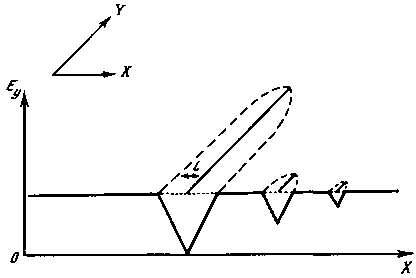 Начнем наши примеры со структур, возникающих на плоскости xy в резко анизотропном потенциальном поле. Примем, что потенциал везде ориентирован в направлении y, во всех других же направлениях потенциал равен нулю. Пороговую функцию при этом зададим скалярной величиной; примем, что во всем рассматриваемом пространстве она одинакова. При этих условиях структурные элементы будут возникать там, где величина потенциала достигнет величины пороговой функции. Элементы при этом будут всегда прямыми линиями, ориентированными вдоль направления y. Примем, что на линии элемента разгрузка потенциала полная, ширина зоны разгрузки вокруг линейного элемента конечна и не превышает 2l, при этом величина разгрузки при удалении от элемента изменяется по линейному закону (рис. 55). Примем, что в вершине структурного элемента (у конца линии) ширина зоны разгрузки и ее «глубина» равны нулю и лишь на каком-то удалении от конца, допустим на расстоянии порядка 2l, она достигает конечной ширины и «глубины» — полностью разгружает потенциал (см. рис. 55).