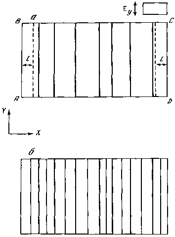 Теперь предположим, что элементы развиваются медленно. Тогда по всему полю в случайных местах, определяемых микрошероховатостью, будут возникать короткие растущие линии (штрихи). Пока они короткие (меньше 2l), их окружает узкая зона разгрузки, поэтому новые элементы могут возникать вблизи с предыдущим. Появление новых элементов и удлинение первоначальных приведет к тому, что вся поверхность перекроется зонами их разгрузки и развитие структуры остановится (рис. 57, а). Если после этого продолжать наращивать значения потенциала, то сразу же начнется удлинение элементов — они будут взаимопроникать в зону разгрузки других, встречных элементов. Возникнут условия конкуренции. Если встречаются два коротких элемента (меньше 2l) разной длины, то у более длинного зона разгрузки глубже, поэтому он будет проникать в зону разгрузки короткого элемента быстрее, чем короткий в его зону разгрузки. В итоге за счет преимущественного развития наиболее длинных элементов структура, изображенная на рис. 57, а, трансформируется в структуру, подобную приведенной на рис. 57, б. Если при соблюдении условия конечности максимальной ширины зоны разгрузки и дальше продолжать наращивание потенциала, то в итоге можно добиться того, что все элементы пересекут массив. После этого наращивание потенциала приведет к возникновению элементов второй генерации. Если же элементы могут постоянно углубляться и расширять зону разгрузки, то в условиях конкуренции мелкие элементы могут вырождаться.