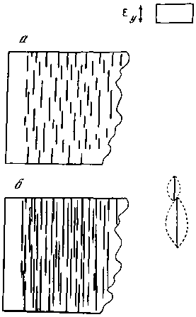Другое условие: пусть в пределах массива потенциальный рельеф имеет общий наклон от линии AD к линии ВС. Линия AD — это гребень рельефа. Тогда при наращивании потенциала условие Ey = P выполнится на линии AD. Проникать в массив в направлении ВС линии не могут, там Ey < P. Поэтому на гребне перпендикулярно ему должны возникать коротенькие элементы, зона их разгрузки будет узенькой, и их здесь появится множество. Чем острее гребень, тем короче элементы и тем меньше ширина окружающих их зон разгрузки, тем соответственно большее их число расположится на гребне (рис. 59, а). Если наращивать значение потенциала, то граница области с условием Ey = P начнет смещаться в сторону ВС, граница «потянет» за собой вершины всех элементов (см. рис. 59, б). Острой конкуренции между ними при этом не возникнет, так как ни одна линия не может далеко «вырваться» за линию Ey = P и опередить другие элементы в разгрузке потенциала. При очень сильном наращивании потенциала в наиболее широких полосах между элементами этого рисунка могут появиться элементы второй генерации (рис. 59, б).