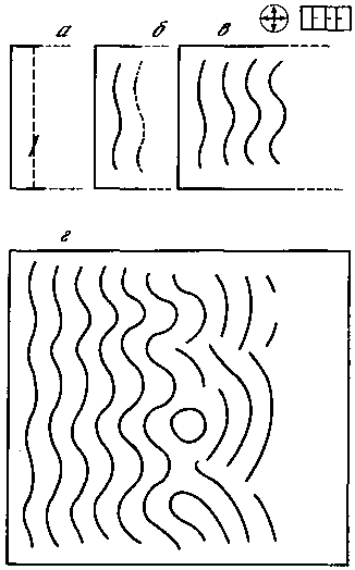 Еще одно специфическое условие. В ранее рассмотренных примерах задавалось, что элемент в зоне разгрузки разгружает составляющую потенциала в направлении, параллельном элементу. В направлении же перпендикулярном величина потенциала оставалась неизменной. Теперь зададим, что в этом направлении возле элемента величина потенциала возрастает (или, что тоже бывает, снижаются значения пороговой функции). В таких условиях при появлении первого коротенького линейного элемента от него тут же перпендикулярно отойдут два новых — возникнет крестообразное сочленение. Новые элементы здесь уже образоваться не смогут, гак как взаимно-перпендикулярные элементы разгружают возле точки своего пересечения потенциал во всех направлениях. При дальнейшем удлинении элементов, как только их вершины отойдут от точки пересечения на величину большую, чем l, возникнут новые элементы — «притоки».