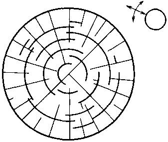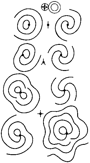 Если потенциальный рельеф представлен перевернутым конусом с основанием, являющимся элементом, который разгружает вокруг себя потенциал, то новый и последующие элементы также будут кольцами, вложенными одно в другое — рисунок параллельных колец. Если же проявится эффект неустойчивости, то, по мере заполнения конуса рисунком, от элемента к элементу будут накапливаться неровности, и к центру рисунка параллельность элементов разрушится (рис. 100). В рассмотренных примерах элементы возле себя полностью разгружают потенциал, поэтому они не могут подходить друг к другу и зарождаться вблизи с другим. Но если на гребне рельефа перевернутого конуса в последнем примере сделать небольшую насечку (нарисовать первый элемент в виде небольшого крючка), то мы при последующем наращивании потенциала получим не систему колец, а спираль (см. рис. 100).