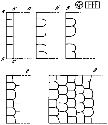 Теперь зададим наклонную поверхность потенциального рельефа. Тогда на линии АВ расположится гребень его максимума. Но потенциал здесь будет иметь только одну составляющую в направлении линии АВ. Составляющая перпендикулярная этому направлению на линии АВ краем массива будет полностью разгружена, т. е. у края массива в полосе шириной l потенциальное поле анизотропно. При достижении на линии АВ условия Е = Р здесь будут зарождаться структурные элементы (рис. 104, а). Проникая в глубь массива, они достигнут границы зоны разгрузки элемента АВ. Здесь поле потенциальной функции становится изотропным. Пересекая «по инерции» эту линию, элемент входит в зону с меньшими значениями потенциала и стремится развернуться в зону с большими значениями — назад к линии АВ (рис. 104, б). При этом вершины элементов будут или встречаться, или заходить в зону разгрузки других элементов и подходить к элементам под прямым углом (рис. 104, в). В результате сформируются тройные сочленения. В узлах тройного сочленения элементов зоны разгрузки накладываются, потенциал здесь разгружен по всем направлениям, поэтому при росте значений потенциала новые элементы будут закладываться на выпуклых участках края структуры, перпендикулярно имеющимся элементам, потенциал в этом направлении здесь ими не разгружен (рис. 104, г). Дальнейшее развитие структуры подобно первому этапу: элементы выйдут из зоны разгрузки и начнут разворачиваться обратно и т. д. (рис. 104, д). В этой структуре размер полигонов в направлении смещающейся границы будет выдержанным.