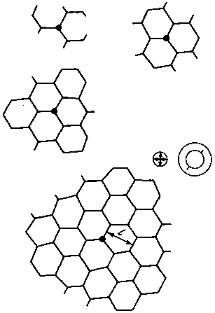 Если потенциальный рельеф задать в виде конуса, то в случае заложения в его вершине тройного сочленения элементов при возможности их быстрого разворота сформируется упорядоченная структура, состоящая из шестиугольников (рис. 106).