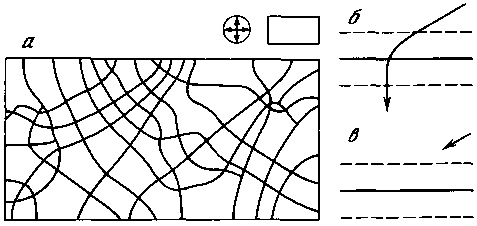 В изотропном однородном поле при моментальном образовании элементов и условии разгрузки потенциала в направлении, параллельном элементу, возникнет структура, изображенная на рис. 109, а (ср. с рис. 103). Отметим важный момент. В этих условиях при косом заходе одного элемента в зону разгрузки другого он разворачивается и подходит к элементу перпендикулярно, соответственно после пересечения элемента он выйдет из зоны разгрузки (с другой стороны) уже под прямым углом (см. рис. 109, б, в). То есть по рисунку можно определить, куда двигался элемент.