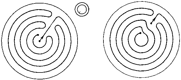 Подобные примеры мы рассматривали ранее, но там элементы возникали в точке Е = Р. Здесь же мы будем первичное положение элемента задавать сами, не дожидаясь, пока Е достигнет Р, и соответственно можем контролировать число элементов. Ограничимся пока одним элементом, причем примем, что движется лишь один его конец. Зададим, что вершина элемента не обладает инерцией (легко разворачивается) и движется даже при малых значениях потенциала. Останавливается она лишь тогда, когда в ее окружении везде Е = 0, т. е. мы приняли очень высокую концентрацию потенциала в вершине элемента. Структуры, возникающие в этих условиях, показаны на рис. 114—119. На рис. 120, 121 показаны структуры, возникающие при одновременном появлении двух точек. На этих рисунках мы видим, как элементы, полностью разгрузив потенциал в доступном пространстве, останавливаются. Теперь зададим, что на линии потенциал разгружен полностью, а при удалении от него степень разгрузки линейно снижается и на расстоянии l потенциал совсем не разгружен. В этом случае между двумя параллельными следами всегда будет оставаться гребень ненулевых значений потенциала, и элемент будет иметь возможность выйти из тупика по этому гребню. Дальнейшее развитие некоторых из только что рассмотренных структур до стадии появления элементов третьей генерации показано на рис. 122, 123.