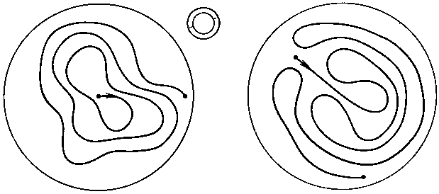 Выигрывают в конкуренции и продолжают существовать те организмы, которые наиболее активно поглощают ресурсы. Поэтому улитка должна двигаться в том направлении, где больше пищи. Это ее потенциал. Слой пищи на стеклах аквариума неравномерен, где-то он уже съеден другими улитками. Для улитки важны и факторы среды: температура воды, содержание кислорода, гарантированность от нападения хищников и т. п. Поэтому в итоге моллюск движется туда, где больше пищи, лучше условия и меньше опасность — туда, где выше суммарный потенциал жизнедеятельности. Если улитка не видит дальше собственного носа, то, наткнувшись на собственный или чужой след, она должна развернуться. При таком примитивном поведении следы, оставленные улиткой, в зависимости от особенностей потенциального рельефа при отсутствии микро- и макронеоднородностей будут похожи на структуры, изображенные на рис. 114—119. Чтобы выполнить такие рисунки, моллюск должен хорошо чувствовать градиент потенциала и уметь легко, без больших затрат энергии разворачиваться. В противном случае при тех же внешних условиях рисунки изменятся (ср. рис. 130 и 118).