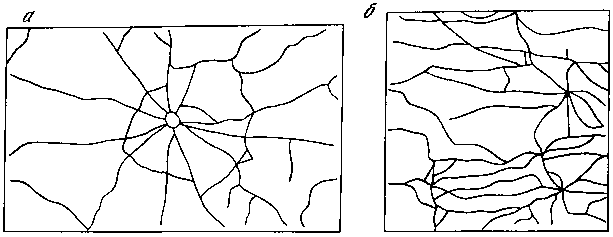 Развитие дорог в их потенциальном поле сходно с развитием трещин, потенциал они разгружают одинаково — преимущественно в параллельном себе направлении, поэтому при сходном потенциальном рельефе рисунки трещин должны быть похожи на транспортные структуры. Проведем такой эксперимент. Возьмем лист бумаги, покрытый тонким слоем стеарина, положим его на мягкое основание и сверху надавим шарообразным предметом диаметром порядка 10 см. На стеарине появится система трещин (рис. 132). Эти структуры развивались в радиально-анизотропном поле напряжений в режиме плавного наращивания значений потенциала. В таком же потенциальном поле развивается транспортная структура вокруг равнинных городов. Как видим, рисунок железных дорог вокруг Москвы (рис. 133, а) похож на рисунок трещин. Для сравнения посмотрим на рисунок центральносевероамериканских железных дорог, возникший в условиях преобладания субширотного транспортного потока (рис. 133, б) Отметим, что индикатриса потенциального поля, в котором развиваются дороги, может иметь форму восьмерки. В этом случае возможны остроугольные сочленения.