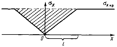 Для нас представляет интерес ширина раскрытия разрыва. По сути, это размер структурного элемента. Рассчитать его несложно. Не вдаваясь в подробности, отметим, что эта величина пропорциональна суммарной разгрузке напряжений вблизи разрыва, суть — высвободившейся при разрыве потенциальной энергии упругонапряженного бруска. Графически ее можно представить площадью фигуры, заштрихованной на рис. 14.