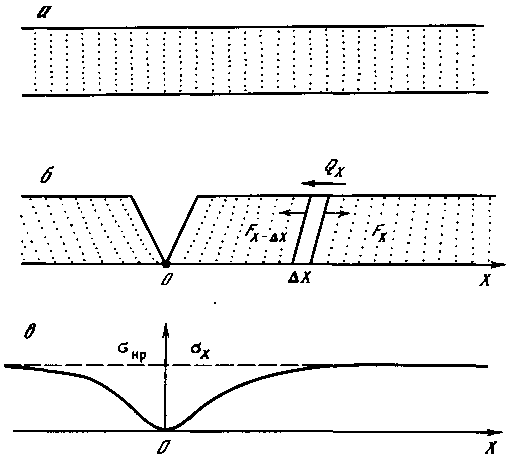 В итоге получаем, что после образования трещины напряжения у ее края равны нулю, а при удалении экспоненциально асимптотически увеличиваются, стремясь на бесконечности к величине, равной напряжениям в ненарушенном массиве. В данном случае — к напряжениям, равным прочности бруска на разрыв (см. рис. 19, в), т. е. четкую зону разгрузки выделить нельзя, теоретически трещина разгружает в той или иной степени весь массив. Если так, то в нашей модели вторая трещина, если температура не снижается, должна возникнуть на бесконечном расстоянии от первой. Но при удалении от трещины напряжения растут очень быстро, и на расстоянии, в несколько раз превышающем глубину трещины, разгрузка напряжений почти незаметна. Но продолжим рассматривать идеальную схему.