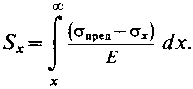 Величину сдвига верхней части элементарного бруска S можно определить, рассчитав, насколько в сумме сократилась длина части бруска, лежащая вправо от элементарного бруска. Эту часть также разобьем на элементарные бруски шириной x. После образования разрыва верхняя грань каждого из них в соответствии с законом Гука сжалась на величину l = x(пред– x)/Е. Запишем dl = (пред– x) dx/E. В итоге, после интегрирования получаем сдвиг элементарного бруска: