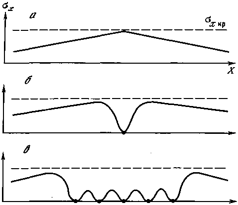 Изменим условия эксперимента. Начнем охлаждать протяженный брусок, имея максимум охлаждения в центре (рис. 20, а). Здесь напряжения в первую очередь достигнут величины, равной прочности, и появится трещина. Ее появление приведет к формированию вокруг двух новых максимумов напряжений (см. рис. 20, б). Последующее охлаждение бруска приведет к заложению в этих точках новых трещин. Соответственно уже рядом с ними появятся новые максимумы напряжений (см. рис. 20, в) и т. д. Если наклон кривой функции напряжений при этом в ходе их наращивания не изменится, то в итоге появится пространственная периодическая структура.