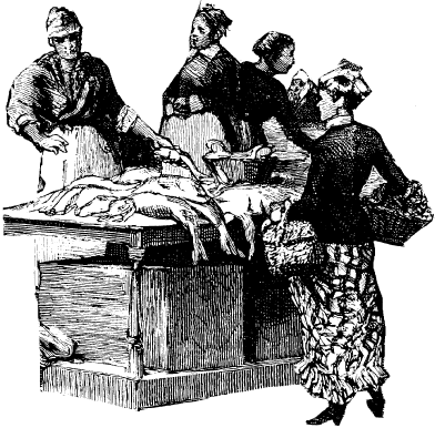 Представьте себе мрачный двор, окруженный высокими полуразрушенными каменными стенами. В них на расстоянии семи или восьми футов от земли вделаны крюки. Сразу догадываешься, что это бойня. С левой стороны — решетка, через нее видна туша быка, подвешенная к массивным бревнам потолка. Лужи крови покрывают каменные плиты и стекают в желоб, наполненный всякими отбросами. Свет, проходя между трубами с флюгерами, вырисовывающимися на клочке неба величиной с ладонь, падает сверху. Соседние крыши отбрасывают тень, которая книзу становится все гуще. В глубине двора виднеется навес, под ним — дрова. На них лежат лестницы, несколько охапок соломы, какие-то веревки, клетка для кур и старый развалившийся кроличий домик.