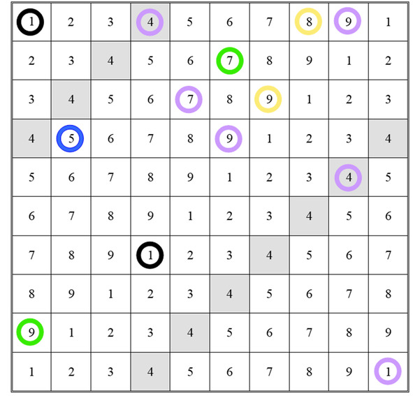 Представим числовой ряд от 1 до 100 в форме матрицы 10х10 и проведём исследование самих чисел и их взаимосвязей, как «математическое» отображение преобразований, изменяющих качество и вид Вселенной. Назовём эту матрицу матрицей Развития (преобразования) Вселенной (таблица 1).