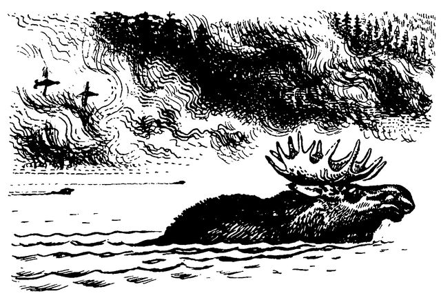 Уг не ошибся: далеко в овсах была засада, хотя люди подстерегали не его, они ждали медведя, который приходил сюда, на поле, полакомиться овсом. Но Уг, чуткий и внимательный, на большом расстоянии разгадал место охотничьей засады. Не торопясь, чтобы не поднимать шума, мягко и беззвучно стал уходить лось от опасного соседства, углубляясь в редкий лес. Он перешел лесистую возвышенность, выбрался на опушку, быстро и долго бежал по краю сосняка. Только убедившись, что овсяное поле осталось далеко позади, стал устраиваться на ночлег.