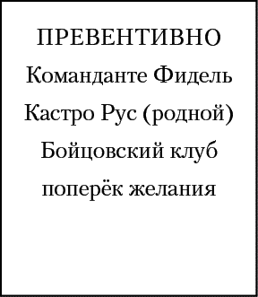 Идём дальше. Почему-то я записал Фидель Кастро Рус полностью. Плюс команданте. Да ещё эпитет: родной. Возможно, дав полное имя и воинское звание, хотел зашифровать само слово «полностью»?