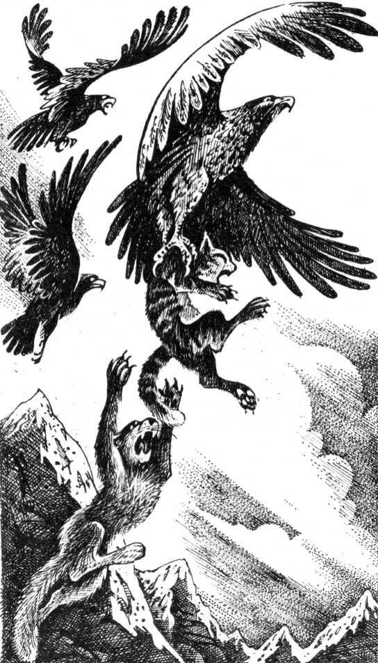 Три орла стремительно поднимались в небо. Отчаянные вопли Звонкого Ручейка стихали вдали. Ужас гнал Серое Крыло вперед, он забыл о боли, о страхе и обо всем на свете, кроме несчастной кошки, бившейся в орлиных когтях. Он перескакивал через камни, падал, снова вставал и бежал изо всех сил, в кровь обдирая лапы.