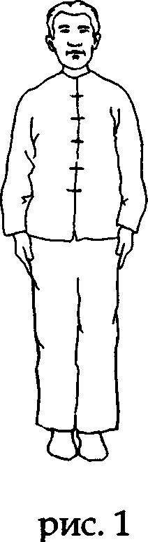 Встаньте ровно, носки и пятки вместе, колени выпрямлены, ладони на бедрах, взгляд через полуприкрытые веки направлен прямо перед собой (рис.1). В первую очередь, постарайтесь, чтобы макушка была как бы «подвешена» вверх, грудь опустите, копчик потяните вниз, расправив таким образом позвоночник. Кончик языка слегка касается верхнего неба. Зубы не плотно прижаты друг к другу, губы сомкнуты, но не напряжены. Сознание погрузите в область нижней части живота (ближе к позвоночнику). Эта область в китайской медицинской и алхимической традициях называют «полем киновари» (даньтянь) [3] . Сделайте несколько вдохов и выдохов нижней частью живота, однако при этом обратите внимание на то, чтобы при вдохе заполнялась не только область живота, но и область почек со стороны поясницы. Словно в кузнечных мехах - на вдохе энергия заполняет вас, а на выдохе она устремляется ко всем жизненно-важным органам тела. Это так называемое «прямое дыхание». Можно выполнять также и «обратное дыхание», когда нижняя часть живота и почки на вдохе наоборот подтягиваются. За редким исключением, (о чем будет сказано специально), при выполнении упражнений можно использовать любой тип дыхания по собственному усмотрению. Еще одним очень важным моментом является то, что дышать нужно не только через нос, но и через поры на коже по всему телу. Они должны раскрыться под воздействием вашей силы сознания (инянь)– так вы сможете соединиться и пульсировать вместе с дыханием Вселенной. Для того, чтобы привести в покой сознание и расслабить мышцы тела (без чего невозможна эффективная регуляция ци), на начальных этапах применяют так называемое «расслабление по девяти частям тела». То есть силой сознания расслабляют сначала область головы и лица, затем область шеи и плеч, затем грудь, лопатки и верхнюю часть руки, затем живот, поясницу и предплечья, затем область ягодиц, затем бедра и свисающие естественно кисти, затем колени, голени и лодыжки, и, наконец, ступни. Можно повторить эту телесную волну расслабления сверху вниз три раза. Постепенно вы научитесь входить в состояние полного расслабления и покоя очень быстро, в конце концов, вам будет достаточно одной только команды вашему телу, как оно тотчас войдет в «состояние цигун».