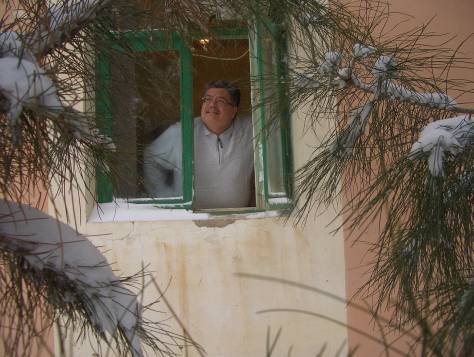 Прижавшись лбами и носами к раме.
