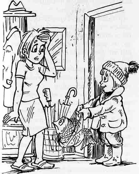 — А там одна рыба! На витрине мороженая, а в аквариуме живая. Плавает, подмигивает. Я на неё уставилась, а продавщица мне строго так говорит: «Девочка! Будешь что-то брать?» Я растерялась. Неудобно как-то получилось: я в магазин зашла, значит, надо что-то купить! Деньги у меня были, те, что мама на смесь дала. Стою я перед прилавком, вспоминаю, что мама обычно на ужин жарит. Вспомнила. «Карпа, — говорю, — мне дайте, пожалуйста». Продавщица сачок берёт — и к аквариуму. Я как заору: «Только не живого!» Она спрашивает: «Спящий подойдёт?» Ну я решила, что она спящим мёртвого называет. Говорят же: уснул вечным сном. «Давайте, — говорю, — спящего». Принесла его домой. В пакете. Холодный был, ужас, я все пальцы отморозила. Мама дверь открывает, а я ей прямо в руки карпа сую и говорю: «Бери скорее, холодно мне!» А мама от неожиданности пакет выронила. «Ой, — кричит, — что это?!» — «Рыба». — «Какая рыба?!» — «Спящая, спящий карп». Мама как закричит: «Я тебя за смесью посылала! Чем мне Полину кормить?!» Я говорю: «А рыбу ей нельзя ещё?» Тут у мамы глаза большие стали. «Ты, — говорит, — ты…» Ну пытается придумать, как меня назвать. И тут этот карп хвостом шевельнул. И вдруг как подпрыгнет! Прямо вместе с пакетом! Тут уж мы с мамой хором завопили. Она кричит: «Ты ж сказала, он спящий!» А я в ответ: «Проснулся, значит!» В общем, мы его в холодильник запихнули, чтобы папа с ним разобрался. А мама сказала, что никогда меня больше никуда не пошлёт.