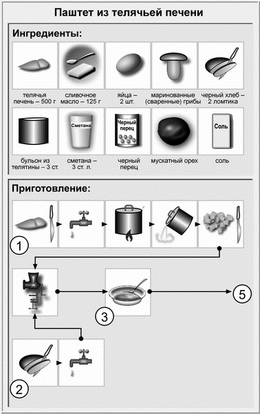 Приготовление: печенку очистить от желчных протоков, испечь на смазанном противне или обжарить на свином жире, после чего охладить, нарезать кусочками и вместе с мякишем хлеба, бужениной и копченой грудинкой пропустить дважды через мясорубку, затем протереть через крупное сито. Смесь посолить, заправить специями и горчицей.