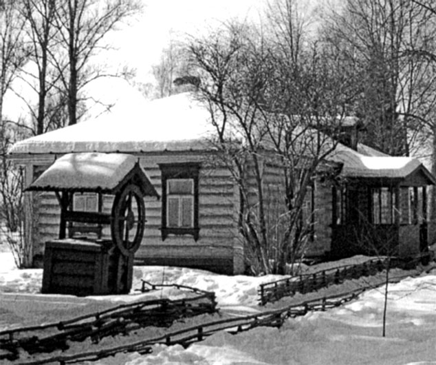 Плетеные оградки, колодезь с ведром на цепи. Куст бузины возле угла рубленой избы-пятистенки: кухни и жилого помещения для прислуги.