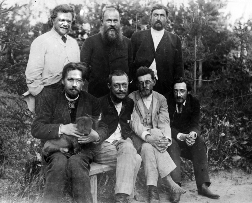 Серпуховской уездный санитарный совет. Стоят: доктор П. И. Куркин, заведующий серпуховской уездной больницей доктор И. Г. Витте, земский гласный князь С. И. Шеховской; сидят: А. П. Чехов, доктор А. А. Кашинцев, М. П. Чехов, председатель Серпуховской земской управы Н. Н. Хмелев.