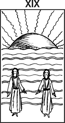 19-й аркан– «Солнце» («Повелитель огня»). На карте изображены близнецы, идущие по берегу моря. Ярко светит солнце. В правом верхнем углу расположена древнееврейская буква Коф, имеющая цифровое значение 100. Число сто символизирует топор.