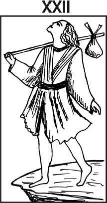 В «прямой» позиции аркан трактуется как радостное, наивное, неопытное эгоцентричное существо. Ему свойственны страсть к приключениям, артистичность, расточительность и непоседливость, в «перевернутой» – небрежность, нерешительность, безразличие.