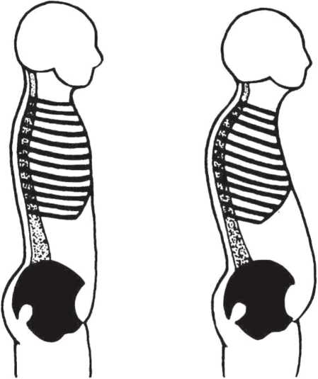Рис. 1. Отклонение формы туловища от нормы: а — правильная осанка; 6 — неправильная осанка (первая степень) Положение позвоночника и форма туловища, положение ребер и грудная полость — по оригинальному рисунку автора.
