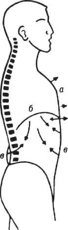 Рис. 12. Дыхание при образовании звука. Стрелками обозначено направление напряжения в области: а — грудной клетки; 6 — диафрагмы; в — брюшной полости.