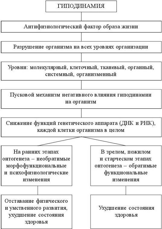 Научные исследования доказали, что длительное ограничение двигательной активности, то есть гиподинамия является антифизиологическим фактором, разрушающим организм на генетическом уровне и приводящим к ранней нетрудоспособности и увяданию (рис. 1). Следовательно, достижения современной цивилизации, создающей комфорт, обрекают человека не только на постоянный «мышечный голод», но и способствуют снижению жизнедеятельности организма и ухудшению состояния здоровья.