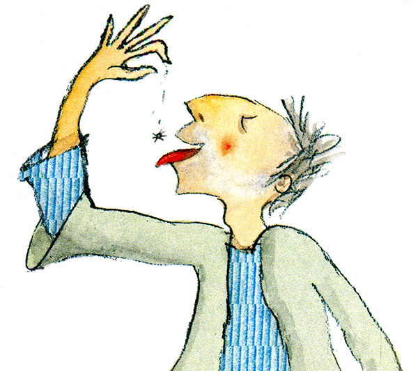 Мушка, однако, оказалась шустра: взмыла со стола и нахально зажужжала у него над головой. Потом она уселась на потолок и оттуда, кверху лапками, наблюдала, как он хлопочет, чирикает, пыхтит и пытается до неё допрыгнуть.