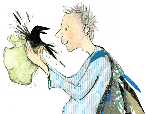 — Уй! Ой-ой! Не отпущу, — отозвался папа. — Я её не обижу, Лиззи. — Он снова поднёс пакет к лицу. — Я ведь твой друг, понимаешь? Друг! — прошептал он, но ворона не захотела с ним дружить. Она проклюнула в пакете дырку, высунула в дырку большой серый клюв и клюнула папу в розовый нос. Потом она высунула в дырку всю голову и злобно вытаращила круглые блестящие глаза-бусины.