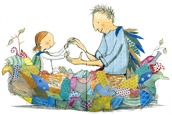 Им понадобились прутья, трава, солома, листья и верёвка, а ещё рваные кухонные полотенца, лоскуты от старой рубахи и шерсть от старого джемпера, тряпки, дырявые носки, перья и ворс от ковра. Они отнесли всё это на кухню и, встав на колени, принялись мастерить гнездо. Лиззи улыбалась и мурлыкала какую-то песенку. Папа щебетал, свистел и каркал.