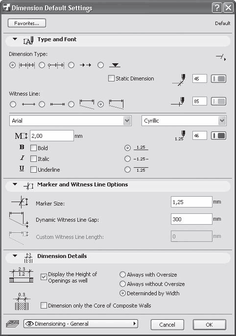 Параметры линейных размеров сгруппированы в трех областях: Type and Font Тип и шрифт), Marker and Witness Line Options (Параметры маркеров и выносных линий) и Dimension Details (Детали размеров).