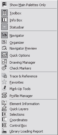 В первой области находится команда Show Main Palettes Only (Показать только основные палитры). Если щелкнуть на ней кнопкой мыши, отобразятся палитры Toolbox (Инструменты), Info Box (Информационная палитра), Quick Options (Быстрый доступ) и Navigator (Навигатор), которые содержат основные инструменты ArchiCAD и отображены по умолчанию. Остальные палитры будут убраны с экрана.