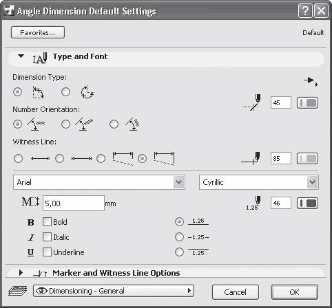 Практически все настройки угловых размеров вам уже знакомы. Новыми являются положения переключателя Dimension Type (Тип размерных элементов) и переключатель Number Orientation (Ориентация размерной надписи).