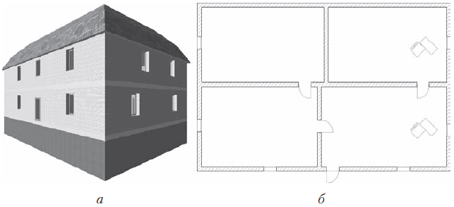 Для рассмотрения принципов построения разрезов постройте двухэтажный дом с фундаментом и крышей, создайте двери и окна (рис. 11.7, а). На плане первого этажа постройте внутренние стены так, чтобы образовались комнаты. У окон двух смежных комнат поместите столы и кресла, взяв их из библиотеки объектов. Приблизительный план первого этажа может выглядеть так, как показано на рис. 11.7, б.