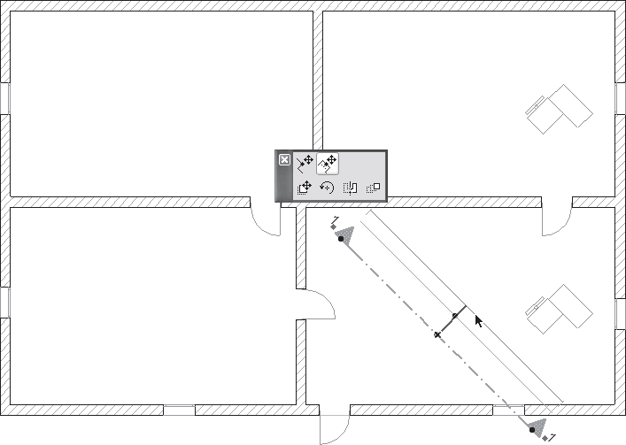 3. Переместите указатель мыши на план соседней комнаты так, чтобы линия перемещаемого сегмента встала перед мебелью (рис. 11.14, а).