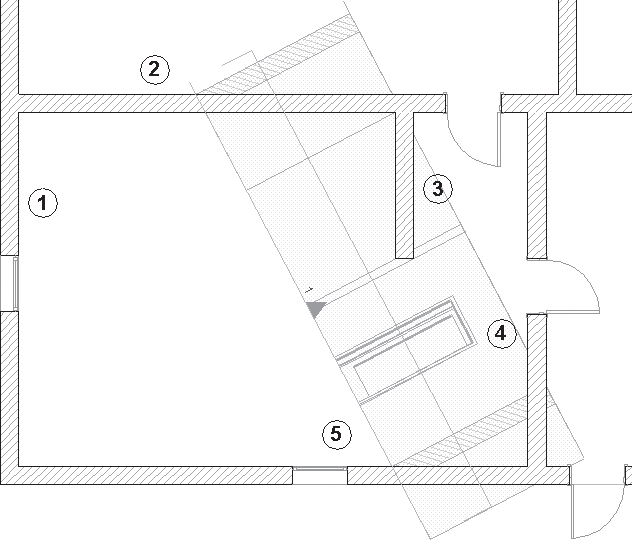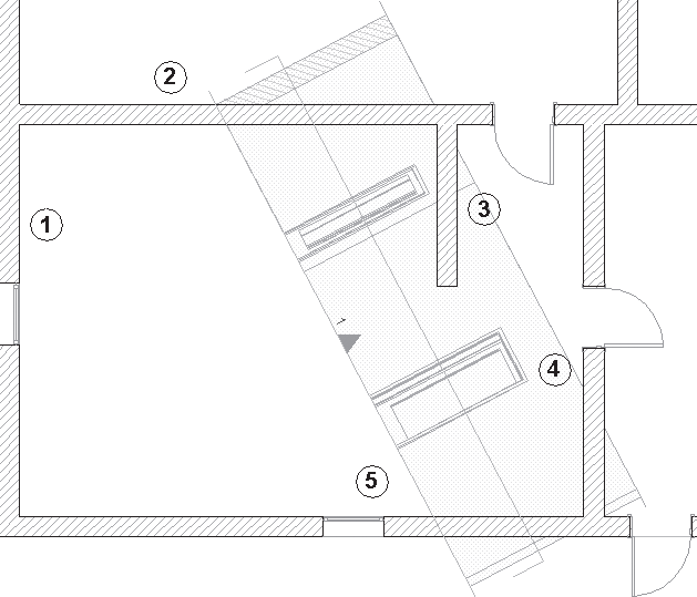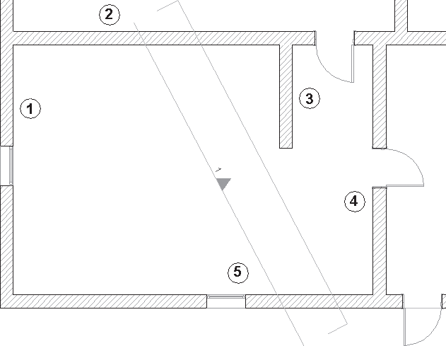 Теперь на виде интерьера осталась только одна стена – 4. Стена 3 не отображается, так как установлен флажок Exclude View Blocking Walls (Убрать мешающие стены). А установка флажка Hide Cut Elements (Скрыть рассеченные элементы) привела к исчезновению стен 2 и 5, поскольку обе они пересекаются линией интерьера.