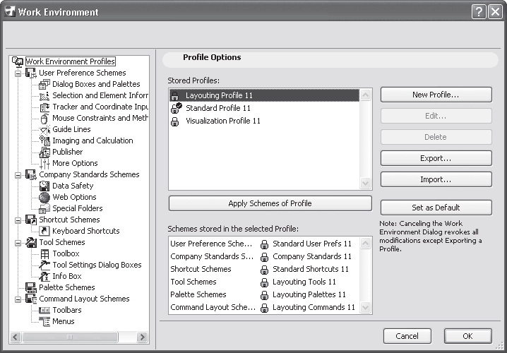 Как вы уже могли понять, основные настройки рабочей среды выполняются в диалоговом окне Work Environment (Рабочая среда). В древовидном списке этого окна видно, что его верхний узел называется Work Environment Profiles (Профили рабочей среды) (рис. 2.14). Этот узел включает в себя шесть узлов второго уровня, имеющих в своем названии слово Schemes (Схемы). Узлы схем, в свою очередь, содержат настройки отдельных элементов рабочей среды.