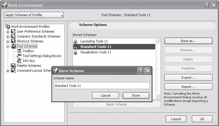 Чтобы успешно работать в ArchiCAD, не требуется создавать собственные схемы и профили, можно просто изменять текущие параметры по мере необходимости. Однако возможность сохранения именованных схем и профилей может быть полезной руководителям проектов, командам проектировщиков и отдельным пользователям, которым по работе необходимо периодически изменять набор текущих инструментов.