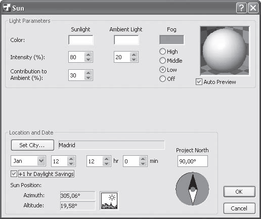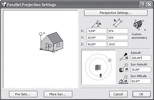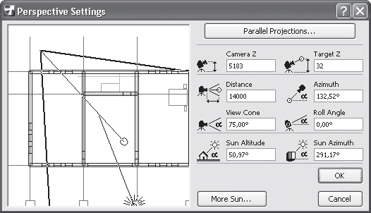 В левой части окна настройки параметров перспективной проекции расположена область предварительного просмотра и динамической настройки. В окне отображаются план активного этажа и графические элементы управления положением камеры и солнца. При щелчке кнопкой мыши на условном изображении солнца и изменении положения указателя мыши при нажатой левой кнопке солнце следует по периметру области за указателем, изменяя свое положение относительно объекта. При этом автоматически меняется значение поля Sun Azimuth (Азимут солнца). Точка фокусировки объектива камеры обозначена кружком на конце линии взгляда. Методом перетаскивания можно менять положение этой точки и камеры, находящейся на противоположном конце линии взгляда. В зависимости от текущего положения этих точек динамически меняются значения соответствующих параметров.